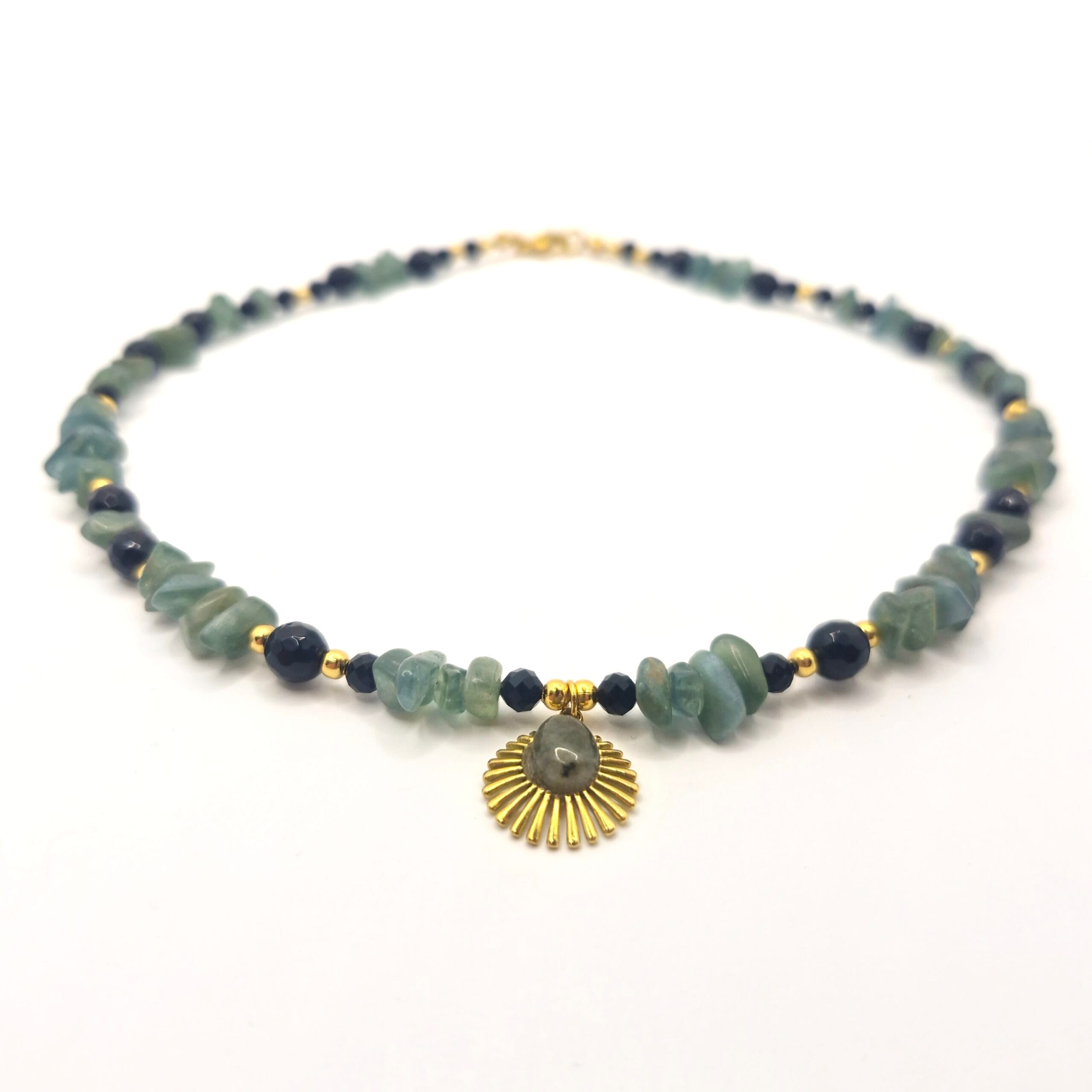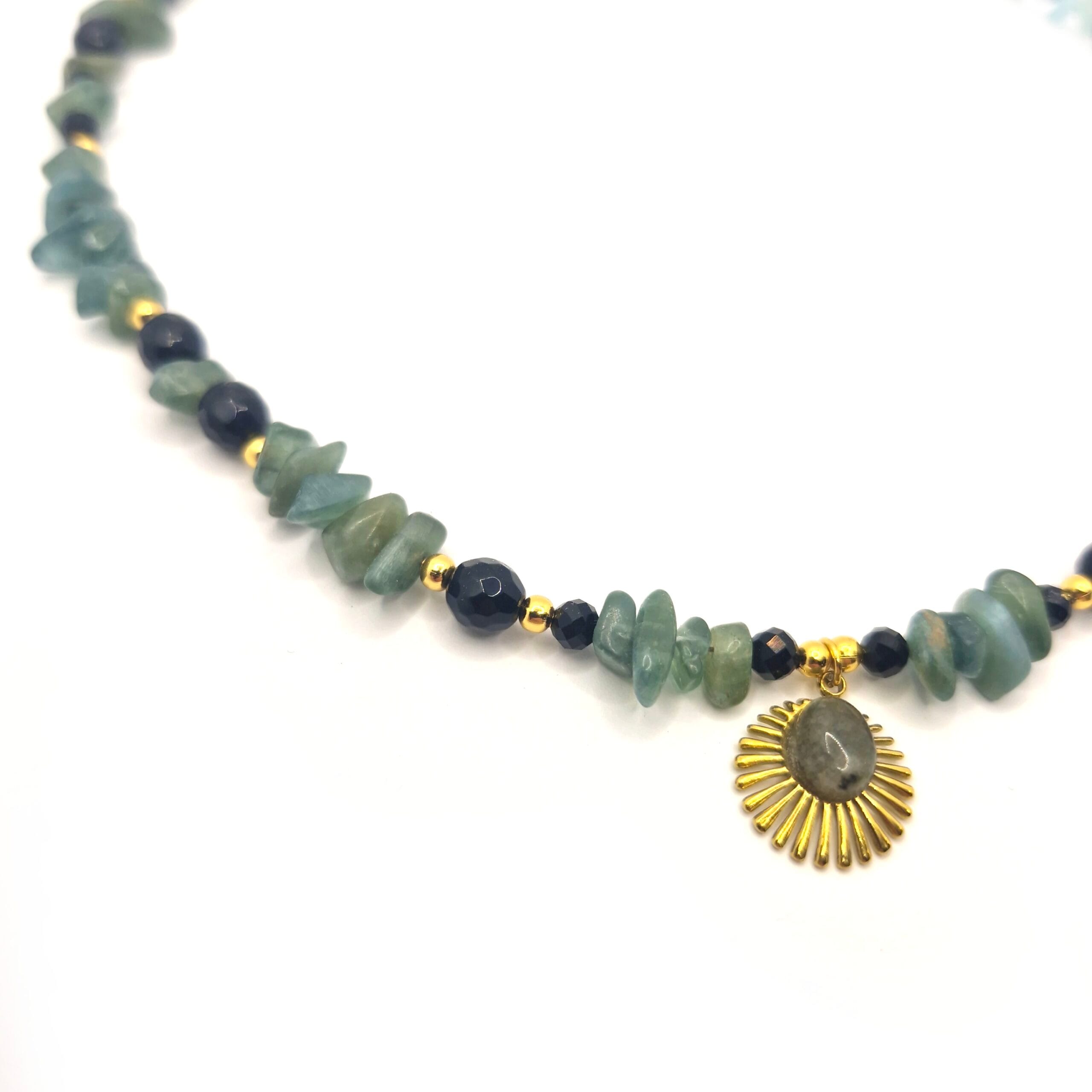Ten wyjątkowy amulet to esencja połączenia z naturą i wewnętrznej siły, którą możesz nosić blisko serca. Nasza autorska kompozycja została stworzona, aby stać się Twoją osobistą tarczą, łączącą kojącą energię roślinnego królestwa z tajemniczą czernią nocy. Naszyjnik prezentuje się niezwykle szlachetnie dzięki zestawieniu nieregularnych, surowych bryłek zieleni oraz precyzyjnie szlifowanych, ciemnych koralików. Całość dopełnia złocona zawieszka w kształcie słońca, która energetyzuje biżuterię, przyciągając do Twojego życia światło, pomyślność i odrodzenie. Produkt dostępny jest w wariancie wykończonym złotem (stal PVD), co podkreśla luksusowy charakter tego magicznego rękodzieła wykonanego z intencją w naszej opolskiej pracowni.